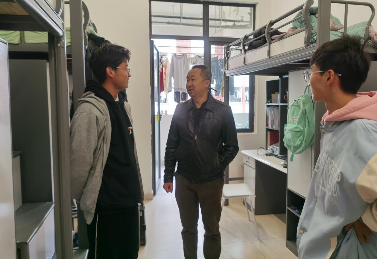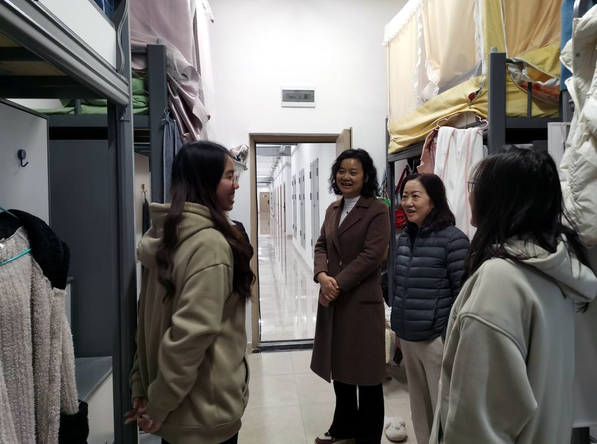 杨飏老师、刘咏梅书记与同学们亲切交谈,了解大家近期学习生活情况,听取大家诉求和意见,并叮嘱同学们看好贵重物品和财产,发现安全隐患问题及时上报老师,希望同学们互相帮助、团结友爱,共同营造温馨和谐的寝室氛围。