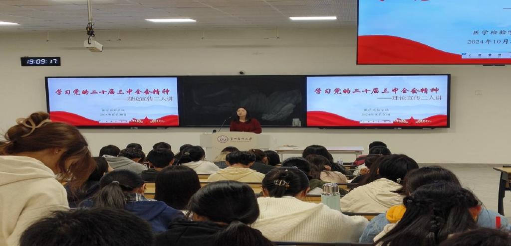 为学习贯彻党的二十届三中全会精神,推进全会精神进课堂,进班级。10月30日,在学院党委的统一安排下,我院依托“一站式学生社区”在云漫湖校区临床R313教室开展党的二十届三中全会精神“理论宣传二人讲”活动。学院学生科苏曦、陈阳两位老师作为主讲人,2023级医学检验技术部分学生,2024级医学检验技术全体学生聆听了宣讲。