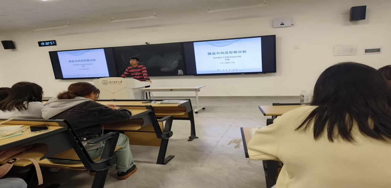 党的二十届三中全会明确提出“完善就业优先政策”,强调“健全高质量充分就业促进机制,完善就业公共服务体系,着力解决结构性就业矛盾”,特别要“完善高校毕业生、农民工、退役军人等重点群体就业支持体系,健全终身职业技能培训制度”。陈阳介绍了党的二十届三中全会的召开背景和重大影响,强调这是在我国迈上全面建设社会主义现代化国家新征程,向第二个百年目标进军的关键时刻召开的一次重要会议,对于统一全党思想、凝聚全国各族人民力量具有重大而深远的意义。紧接着,她通过列举相关数据,着重阐述了重点群体就业支持体系不断完善的社会意义和相关举措。随后,苏曦结合专业实际,向大家介绍了医学检验技术专业的就业方向、行业企业以及相关岗位的具体情况。通过分析近五年我院毕业生的就业结构,他希望大家能够找准自身定位,确立目标,充分利用好大学时光提升自我,为未来的就业打下坚实的基础。