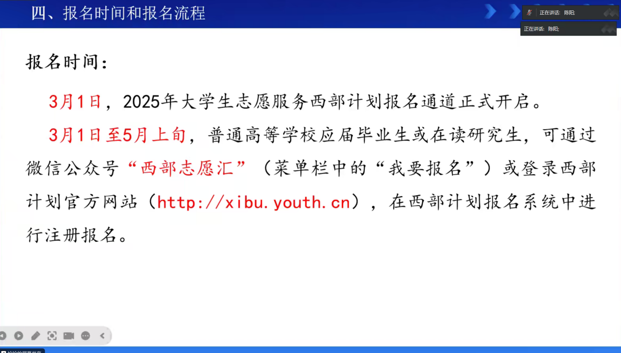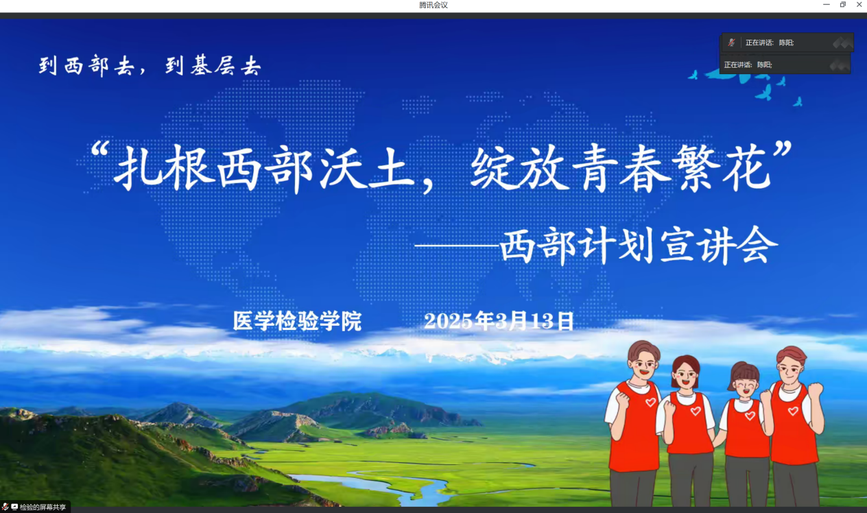 为引导青年学子厚植家国情怀、勇担时代使命,鼓励毕业生积极投身西部基层建设,到祖国最需要的地方书写绚丽青春。2025年3月13日,betway西汉姆联平台团委、学生管理科线上开展了“扎根西部沃土,绽放青春繁花”西部计划宣讲会。学生管理科副科长、2025届毕业生辅导员苏曦、分团委负责人陈阳以及2025届毕业生参加。
