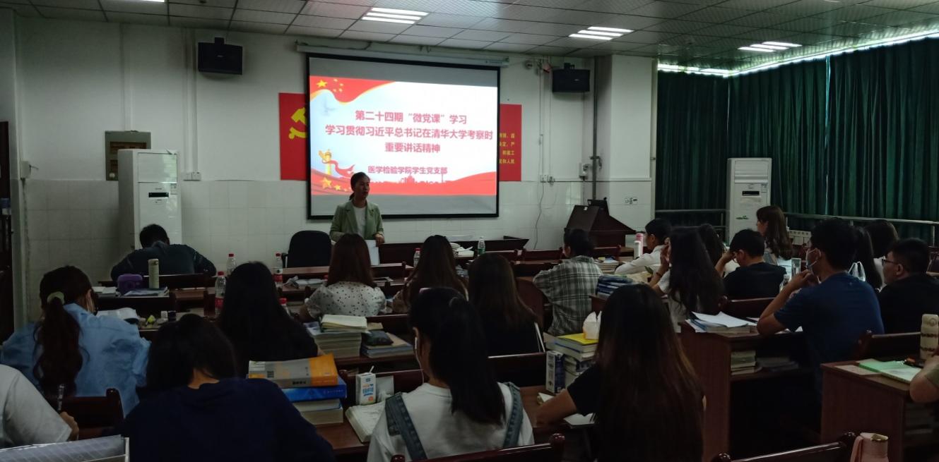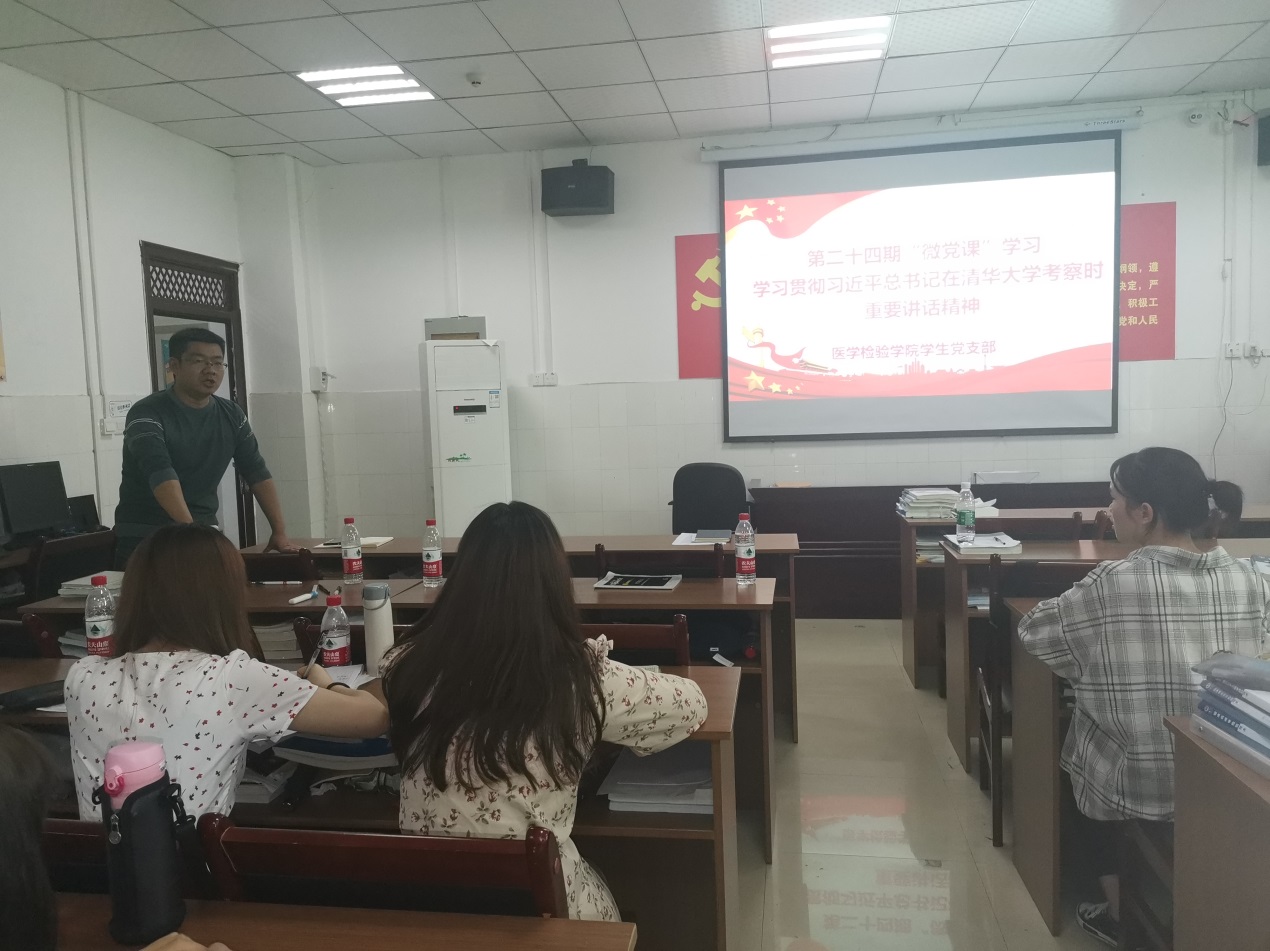 会上,周老师传达学习了习近平总书记在清华大学考察时的重要讲话精神。周老师指出,在中国共产党迎来100周年华诞之际,在第102个五四青年节到来之际,习近平总书记到清华大学考察并发表重要讲话,为新时代青年成长成才指明了前进的方向。习近平总书记在考察时指出:“广大青年要肩负历史使命,坚定前进信心,立大志、明大德、成大才、但大任,努力成为堪当民族复兴重任的时代新人,让青春在为祖国、为民族、为人民、为人类的不懈奋斗中绽放绚丽之花。”周老师要求全体党员同学要牢记殷切嘱托,爱国爱民、锤炼品德、勇于创新、实学实干 。毕业班党员同学即将面临就业创业的人生选择,要将个人理想融入乡村振兴、健康中国建设大局中,将个人命运与祖国发展同向同行,同频共振。会上,同学们踊跃发言,分享学习心得。