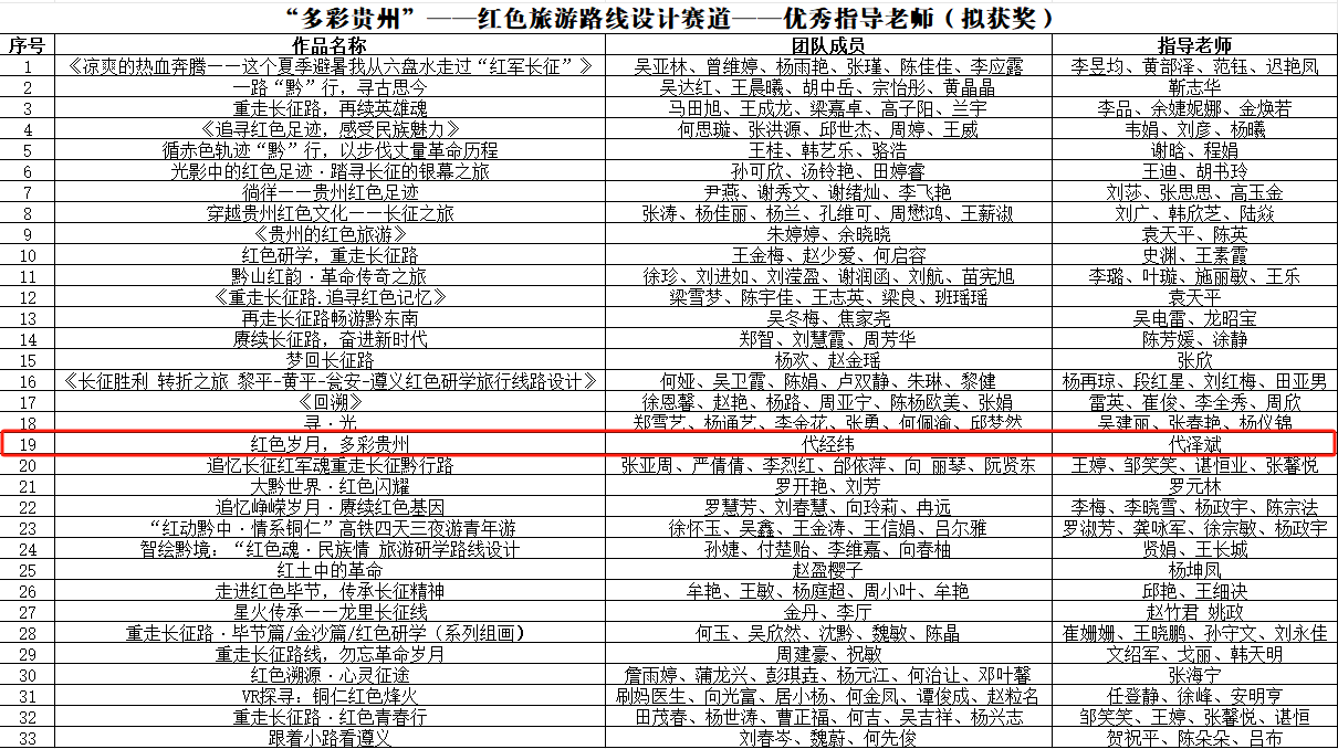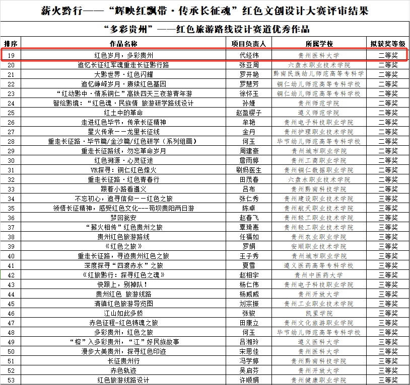 2024年12月,省委宣传部、省委教育工委、省教育厅、省文化和旅游厅举办的薪火黔行——“辉映红飘带·传承长征魂”红色文创设计大赛公示评审结果。经评审,我院在此次大赛中获奖2项,其中学生代经纬在“多彩贵州”——红色旅游路线设计赛道荣获二等奖,指导老师代泽斌荣获“优秀指导教师”称号。