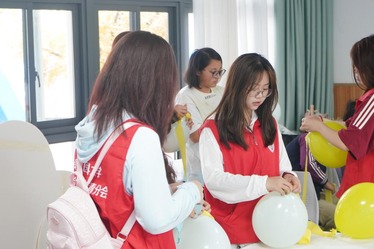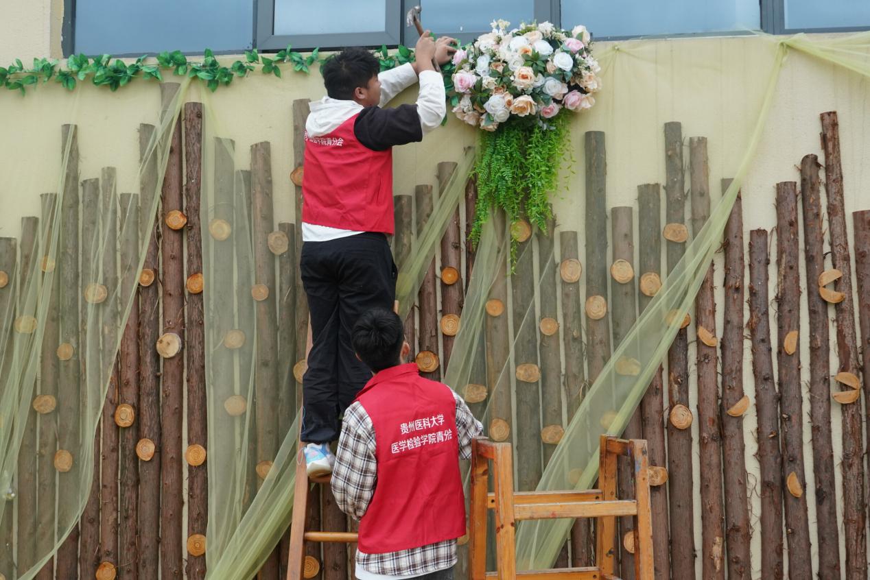 30日,我院10名志愿者来到幼儿园,与幼儿园老师们一同布置游园会场地,布置跳蚤市场摊位及游戏场地。 为了营造轻松喜悦的氛围感,吸引小朋友们活跃参与,志愿者们用各色各样的气球、花朵绿藤的装饰、轻纱垂落的木墙打造出了一个梦幻的童趣乐园。