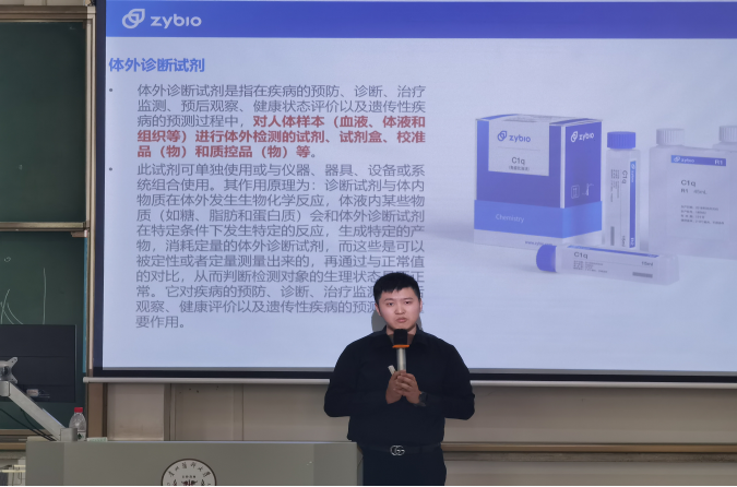 他结合实例,首先阐述了体外诊断定义和意义,引导学生充分认识到体外诊断对疾病诊断和治疗的重要作用。通过详实的数据展示了IVD行业目前的市场规模,市场细分以及政府有关的政策支持。随后,他根据国内外权威数据的对比,从技术创新新兴市场产业链整合三个方面介绍了IVD行业未来的发展重心和产业规模。他提醒大家务必珍惜时光,认真学习,把专业知识学透。研发产品离不开人才,要促进行业健康良性快速的发展,就需要有更多的人才能够投入体外诊断行业。