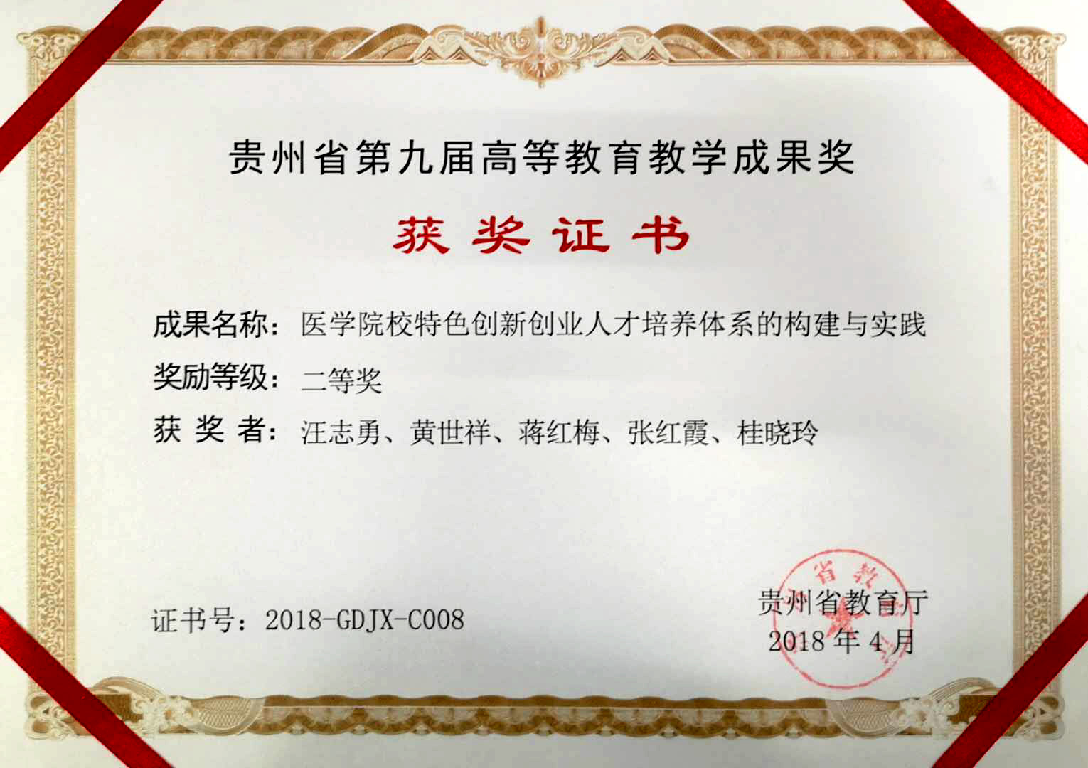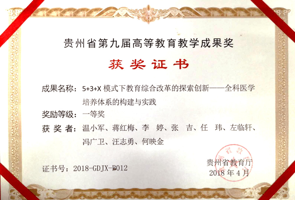 在贵州省第九届高等BETWAY必威成果评比中,我院蒋红梅教授参与完成的《5+3+X模式下教育综合改革的探索创新——全科医学培养体系的构建与实践》(第二完成人)荣获一等奖;《医学院校特色创新创业人才培养体系的构建与实践》(第三完成人)喜获二等奖。