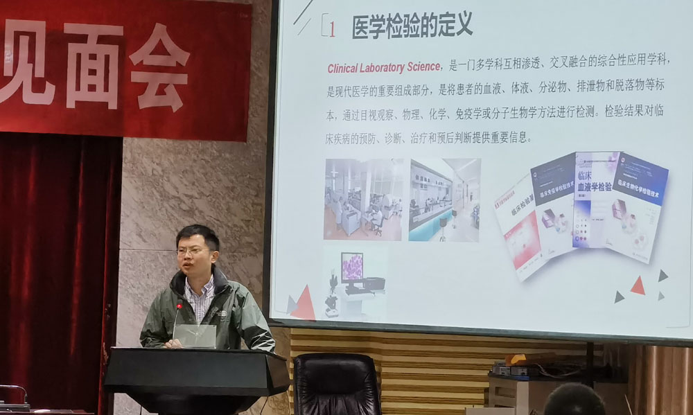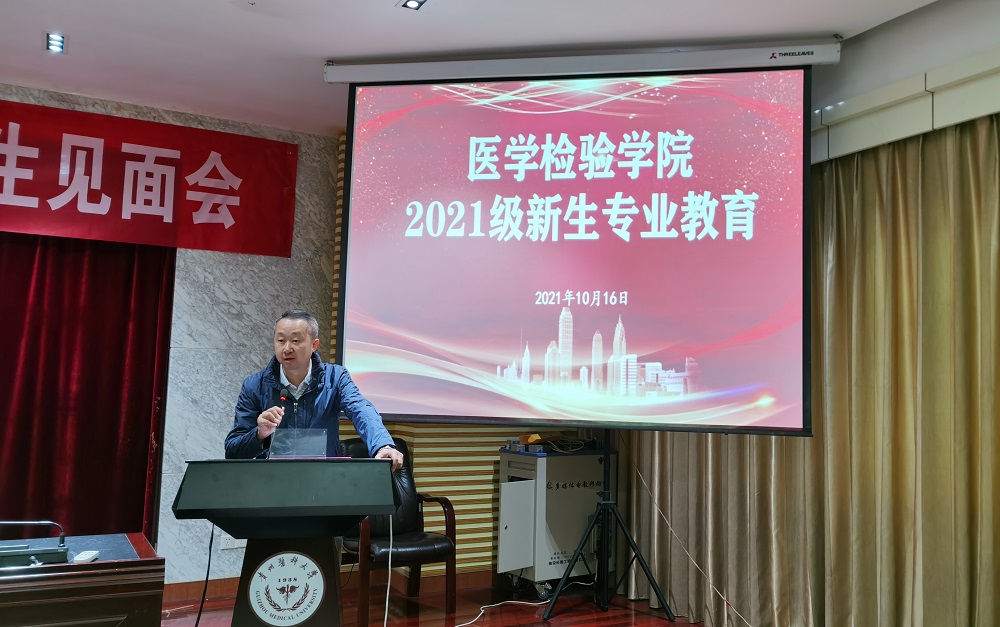 活动首先播放了betway西汉姆联平台建院35周年宣传片,一代又一代勤劳奉献的医检人铸就了今天的成绩。随后,学院院长黄海向新生做专业介绍。他介绍了医学检验的基本情况以及学科在国内外的发展历史。紧接着他对国内医学检验的办学现状,专业的主干课程,发展趋势以及就业方向进行详细阐述。最后,他对betway西汉姆联平台与附属医院临床检验中心“院中心合一”模式进行介绍,增加医学检验学生的使命感和责任感。