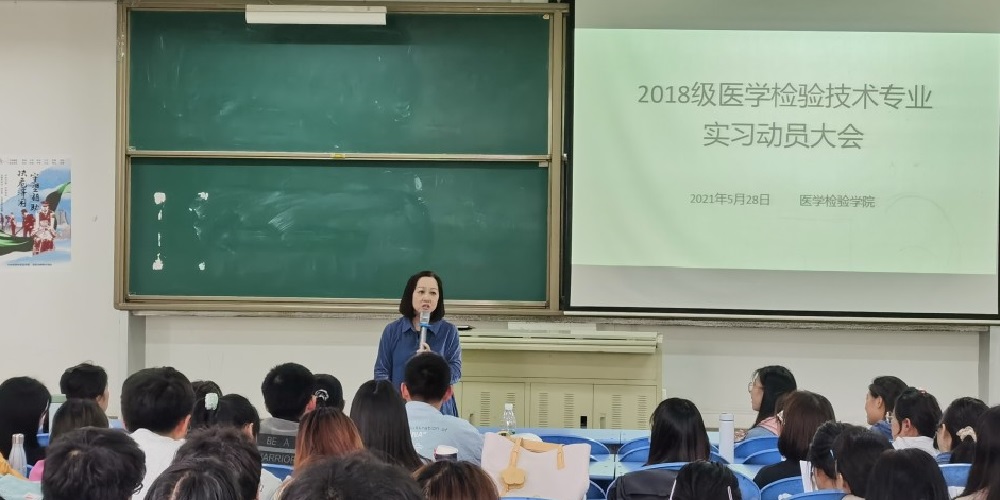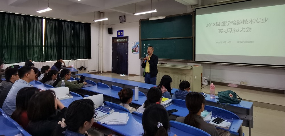 为了有效促进实习工作的顺利进行,激发学生实习热情,增强学生实习责任感,同时确保实习安全。2021年5月28日,betway西汉姆联平台开展了2018级医学检验技术专业实习动员大会,会议由辅导员陈阳主持,学院党委书记彭安辉、正处级组织员杨飏、副院长费樱出席会议,教学科研管理科王世君老师、蔡传斌老师、辅导员苏曦老师以及2018级医学检验技术专业全体同学参加会议。