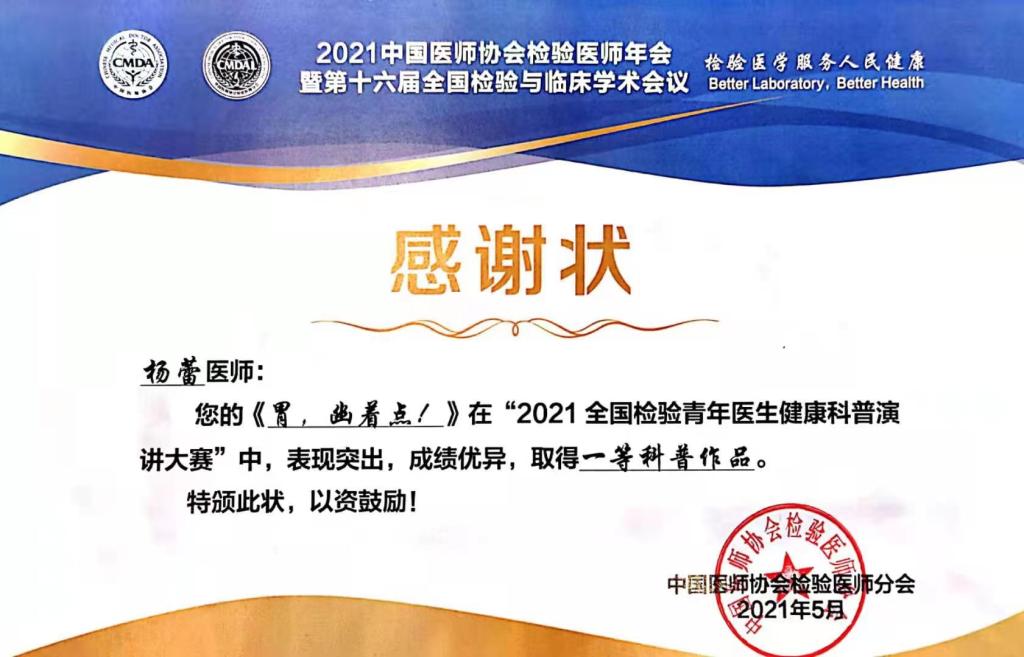 大会组委会收到来自全国各省(自治区、直辖市)的检验青年医生健康科普演讲参赛视频150余份,经组织严格评审,共评选出18个优秀视频。我校betway西汉姆联平台教师杨蕾入围决赛并进行现场角逐,以优秀的成绩喜获一等科普作品。