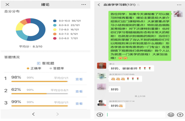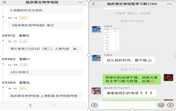 临床检验基础与血液学检验教研室刘咏梅老师以录播课形式实施《临床血液学检验》的网络教学,教学视频采用演示文稿+录音的方式录制,然后通过雨课堂发布,同时刘咏梅老师利用微信群讲解重点难点,划分知识点层次,解答学生的疑问,获得了学生的一致好评。