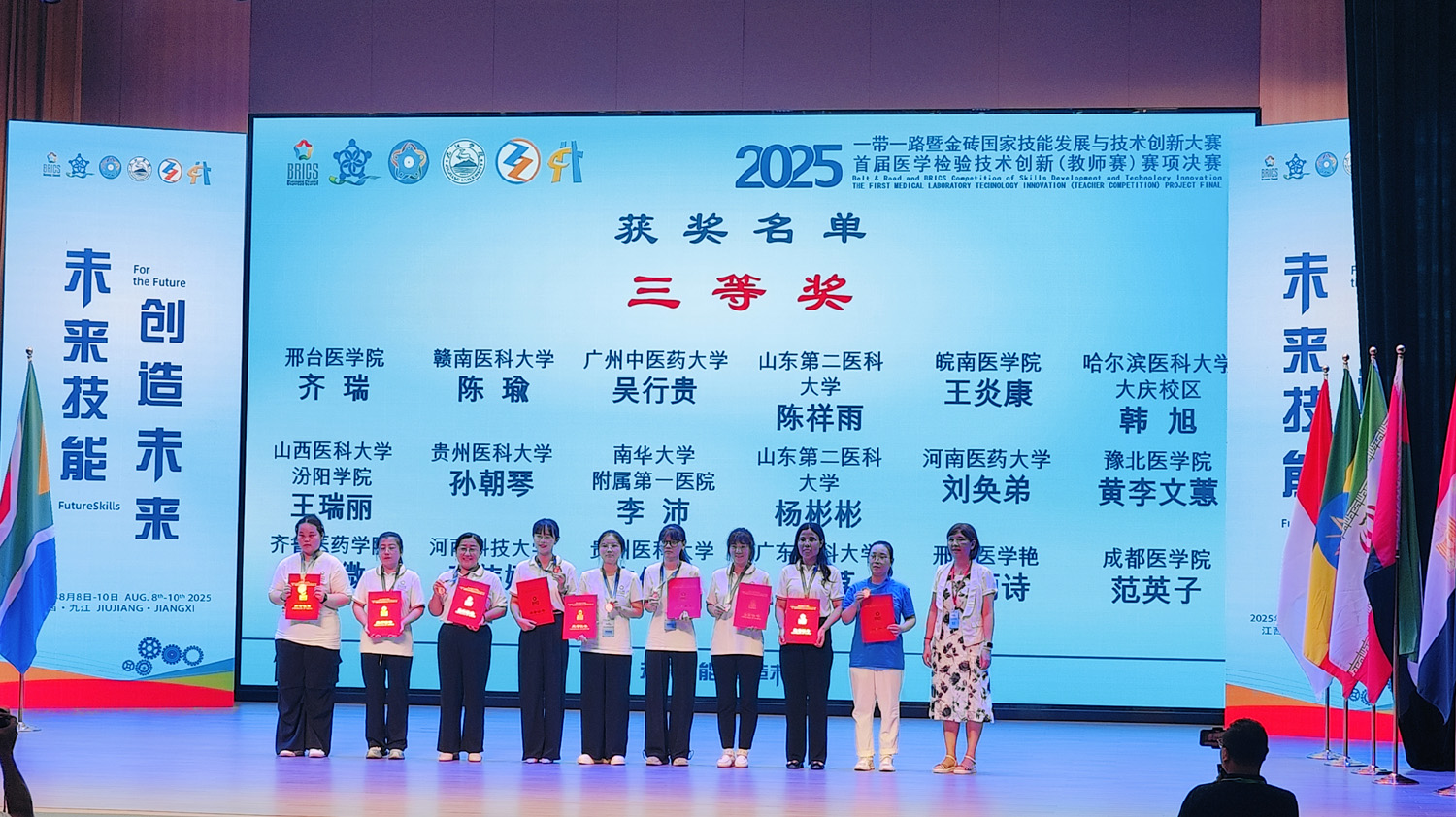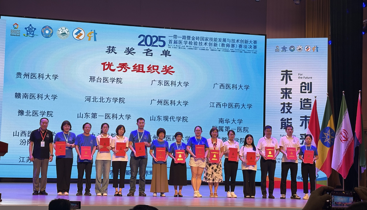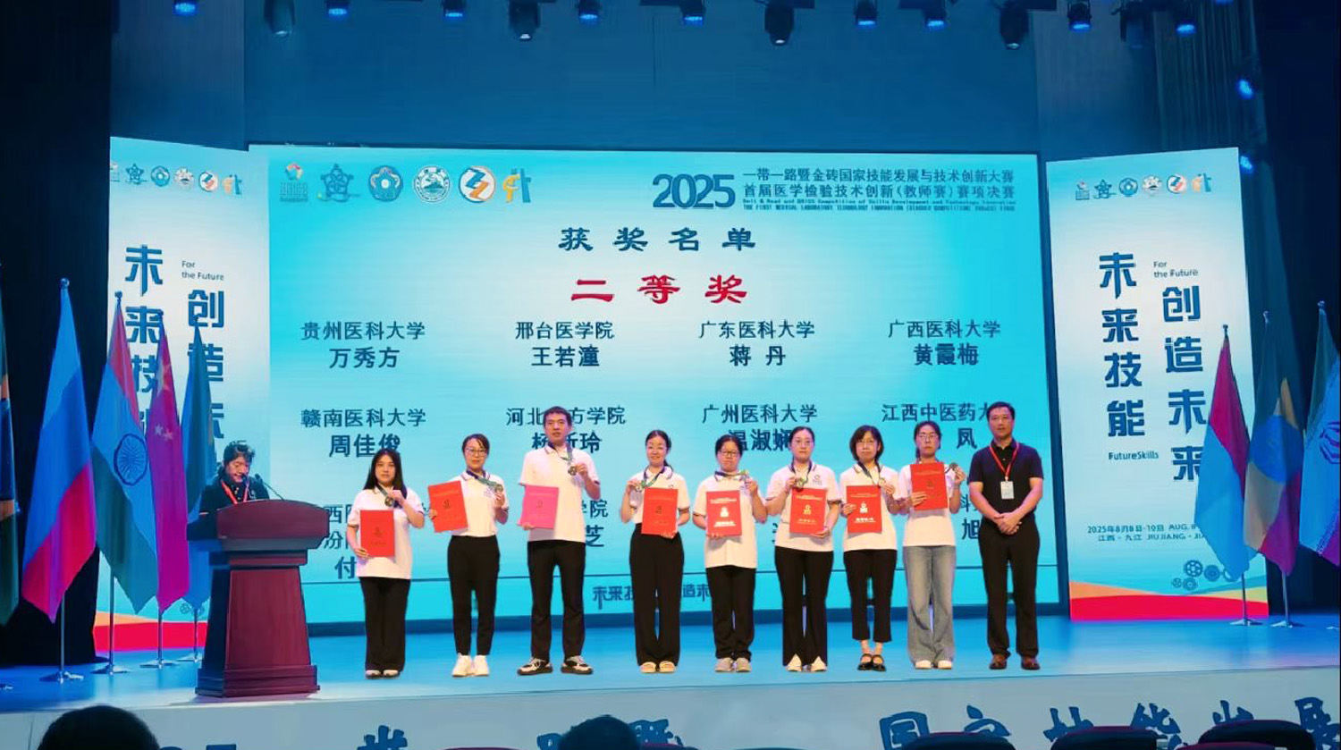 2025年8月8日至10日,首届“一带一路”暨金砖国家技能发展与技术创新大赛医学检验技术创新赛(教师组)与第二届医学检验技能赛项(本科组)决赛在江西九江举行。赛事吸引了全国多所高校的医学检验技术专业师生同台竞技。betway西汉姆联平台派出3名教师和2名学生参赛,在激烈角逐中斩获佳绩:教师组荣获1个二等奖、2个三等奖,两位同学获优秀奖,学院同时获得“优秀组织奖”,充分展现了我院的教学实力与师生风采。